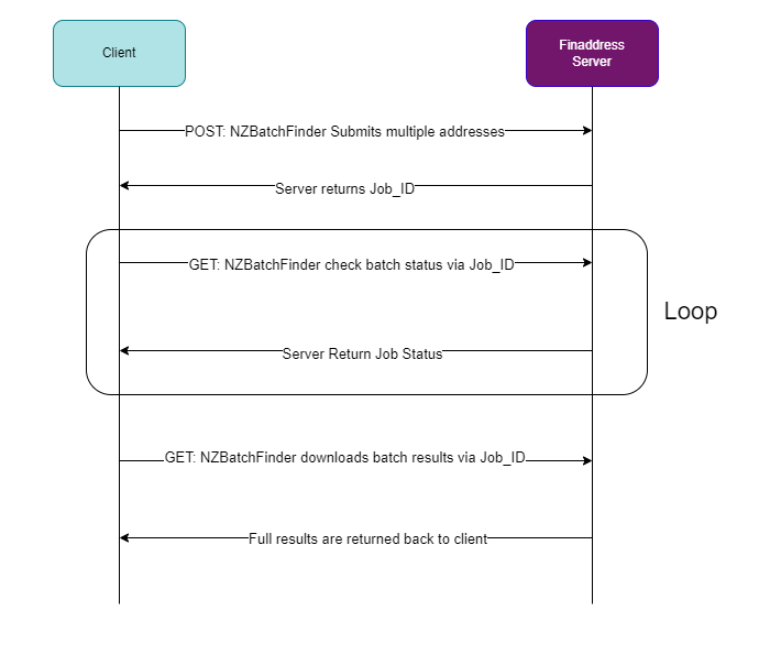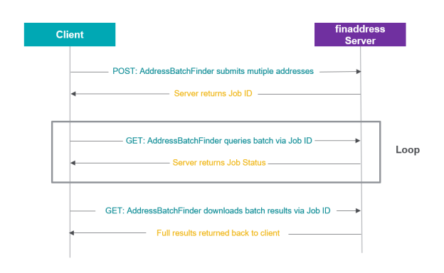 The client can submit multiple raw addresses and the finaddress server will create a batch cleaning job. The service returns a job reference which should be used to check the status of the job and to download the results.